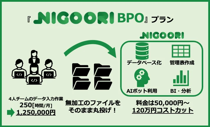 今回の「Nigoori BPOプラン」では、当社が「Nigoori」のお客様に代わってデータインプットを丸ごと代行し、導入・運用の負荷を最小化し、お客様のコスト削減生産性向上に貢献します。